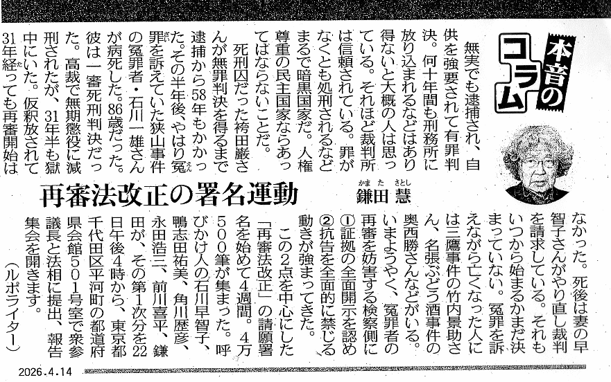 | 東京新聞 本音のコラム 2026年4月14日 |
