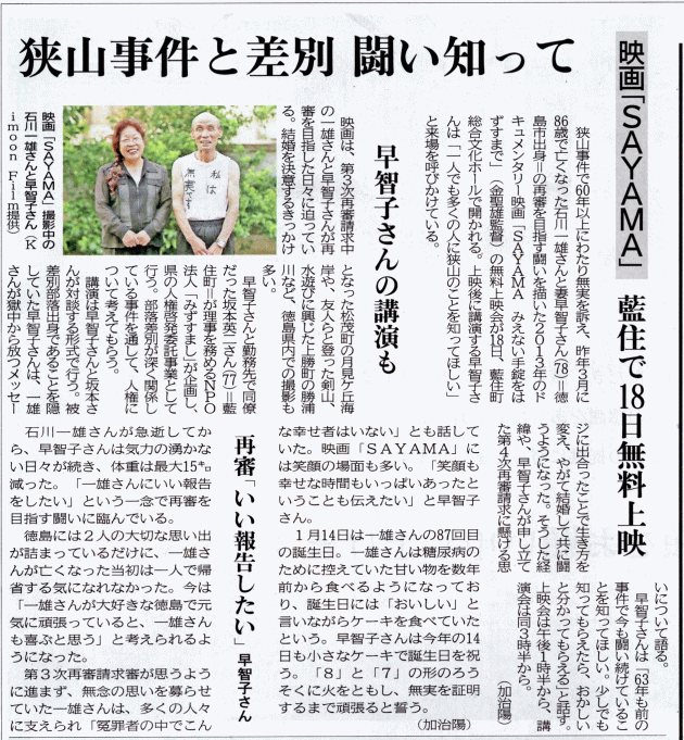 2026年1月18日、徳島で映画「SAYAMA見えない手錠をはずすまで」の上映があります。