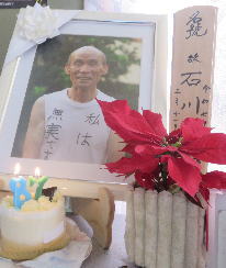 今日 2026年1月14日は石川一雄の87回目の誕生日です。昨年の1月14日は、徳島で、親しい人に囲まれて誕生日を祝いました。一雄はとても楽しそうに、ケーキをみんなと一緒に食べました。今日一雄の祭壇にケーキと87のローソクをまつりました。
