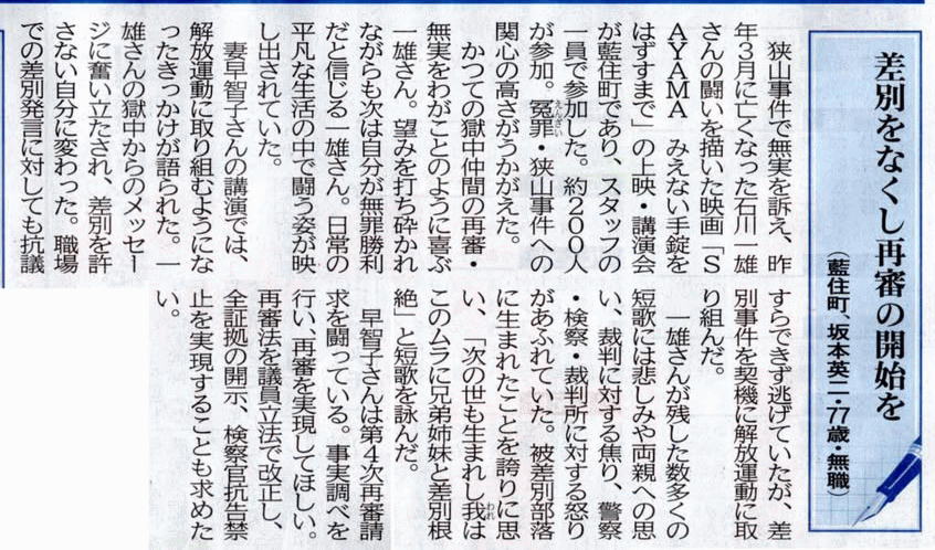 ともに部落解放運動・狭山・労働組合運動を闘い続けた同志坂本さん。 全国にたくさんの同志がいる。 一雄・読んでる? 読者の手紙、さっそく掲載してくれたTさん ありがとう うれしいね。 私も元気に頑張るよ。