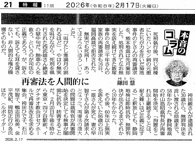 東京新聞 本音のコラム 2026年2月17日