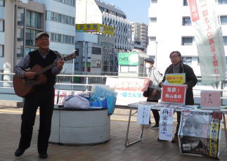 この日は川越駅。連休最終日、汗ばむほどの日だったが、通りすがりの人はいつもより足早に通りすぎる。人々の無関心がえん罪者を、えん罪者の家族を、支援者を落胆させ、苦しめる。その時、住民の会・代表の武井さんがギターを取り出し、「ケ・サラ」を狭山の替え歌で歌いだした。すると通りすがりの人の表情が柔らかくなり、足を止める人も。