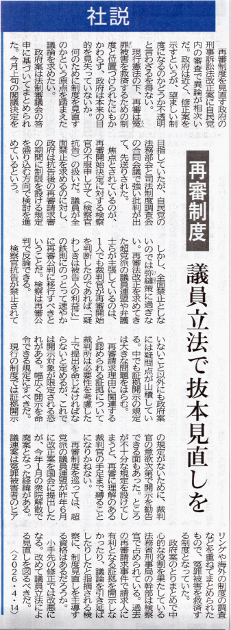 徳島新聞 社説 2026年4月14日