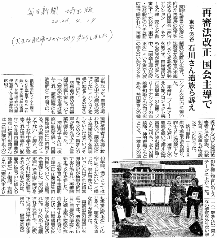 | 毎日新聞 埼玉版 2026年4月19日 |