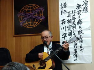 鳥井牧師がギター演奏をしながら、岡林信康さんの「友よ」を歌い、全員で「差別裁判うち砕こう」を歌い、最後にいばらの会の原田会長が「水平社宣言」の朗読。